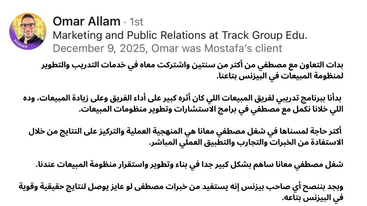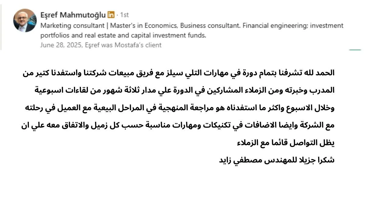وأخيراً نطور معك مهارات المتابعة وإنهاء الصفقات لتتخلص من خسارة المشاريع بسبب المتابعة الضعيفة أو المعدومة. نبني خطط متابعة واضحة تحدد متى وكم مرة وكيف تتابع، ونعلمك طرق جعل العميل يتخذ القرار ويوقع معك. هذا يجعل 3 من كل 10 عملاء محتملين يتحولون لعملاء فعليين، يمنع ضياع أي فرصة، ويجعل العميل يقرر أسرع.